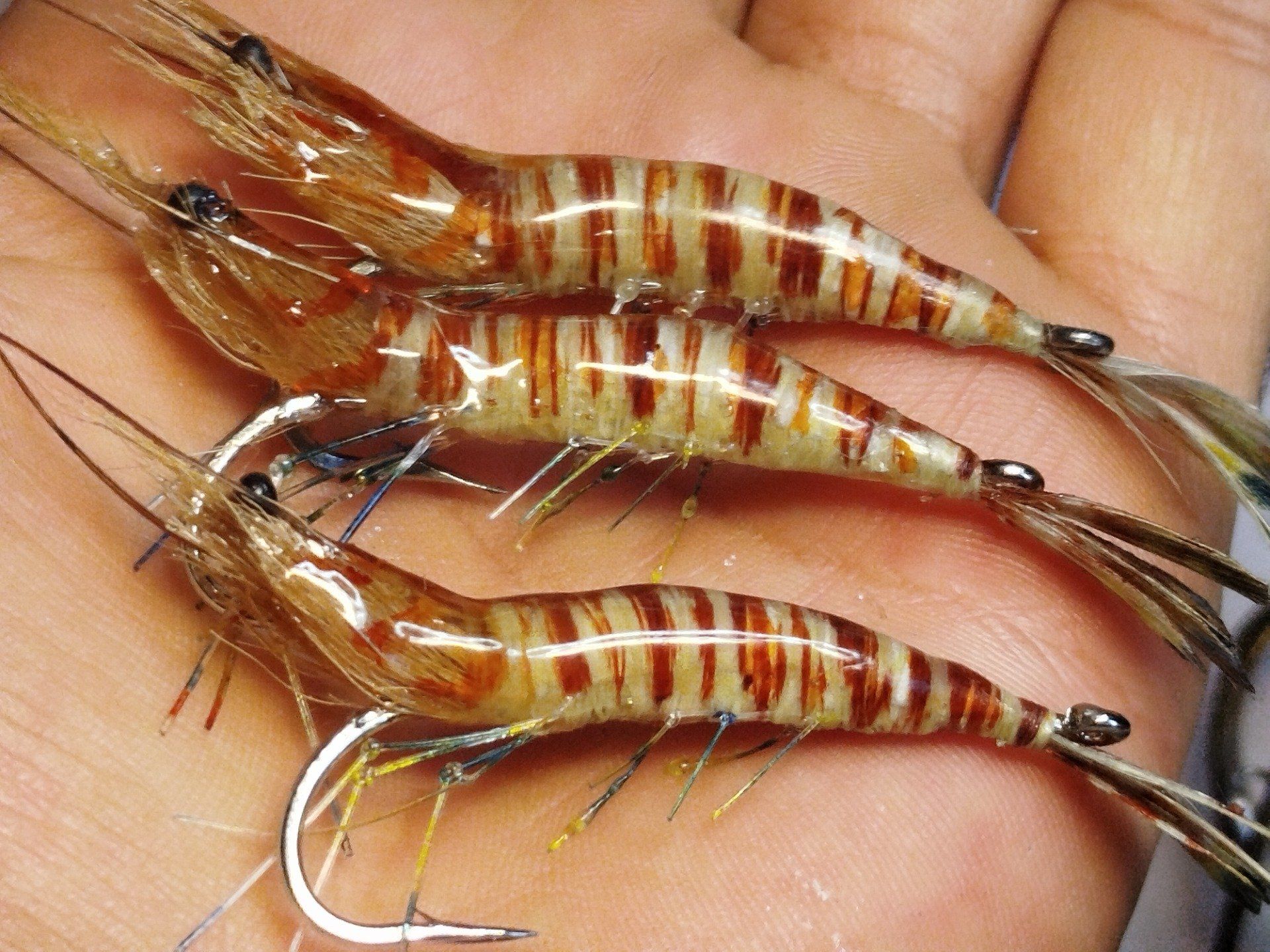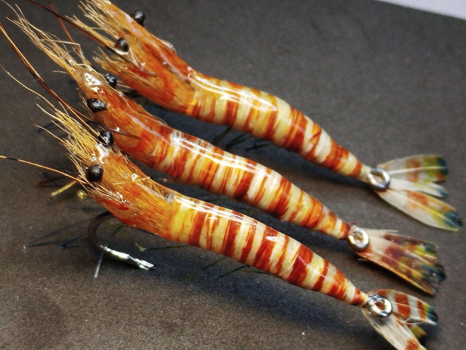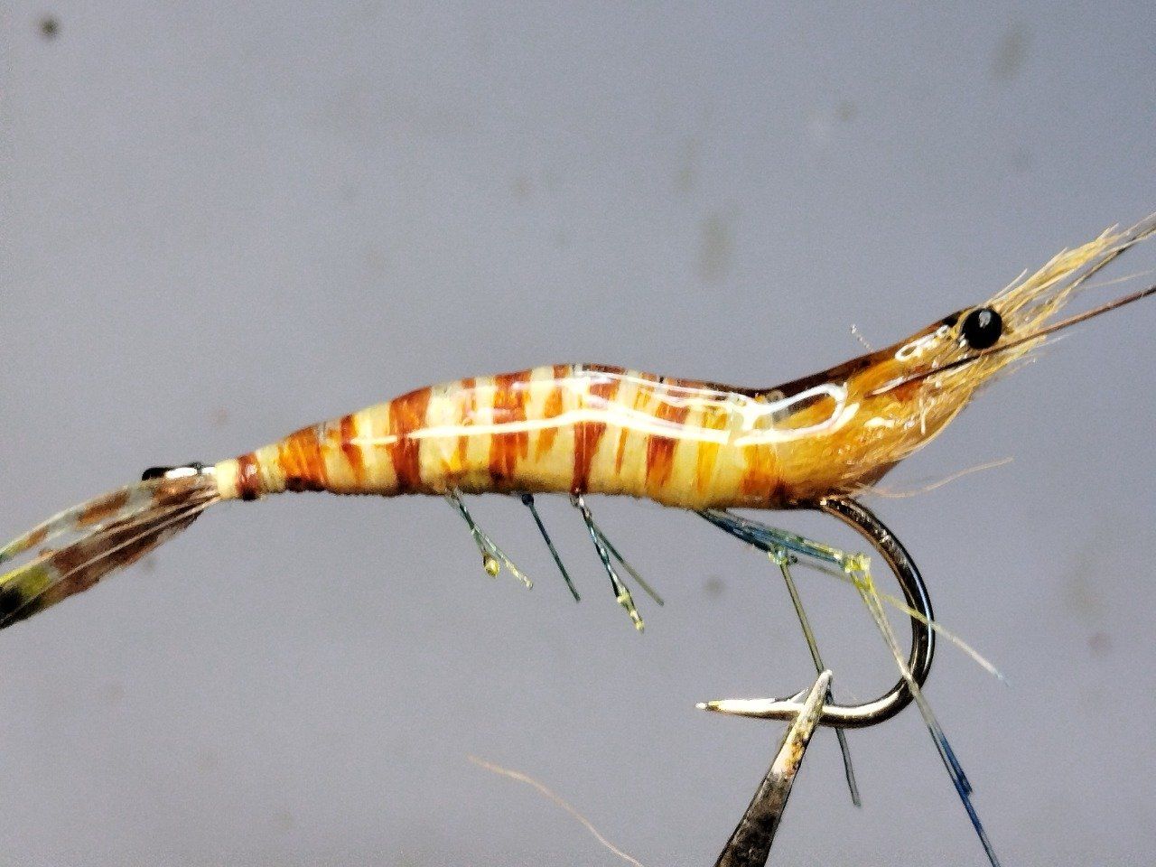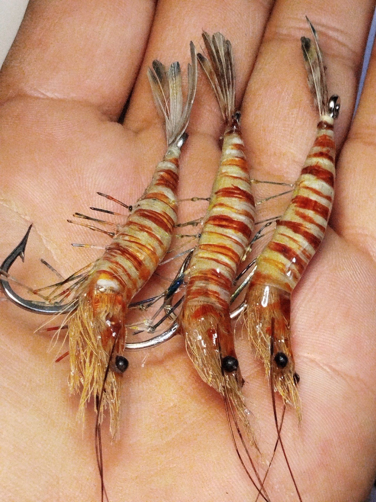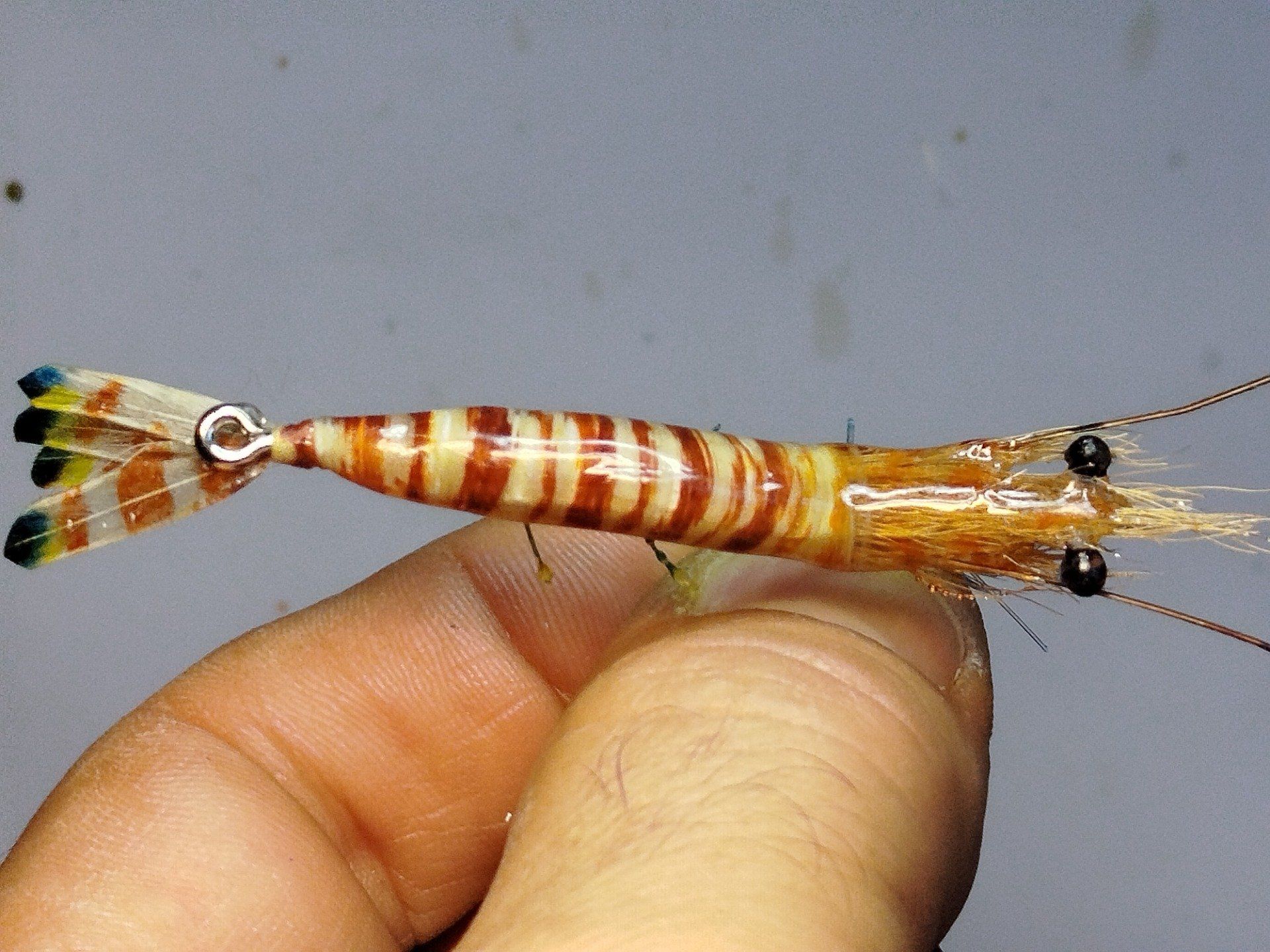 Crevette résine uv entre 7 et 8cm . Poids environ 2g15 . H2/0 mustad mer 34011.