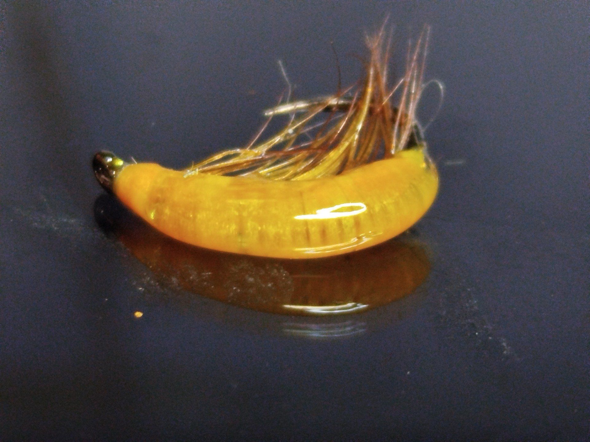 Pattes fin poils de pinceau brun roux, polyfloss jaune orangé, resine uv