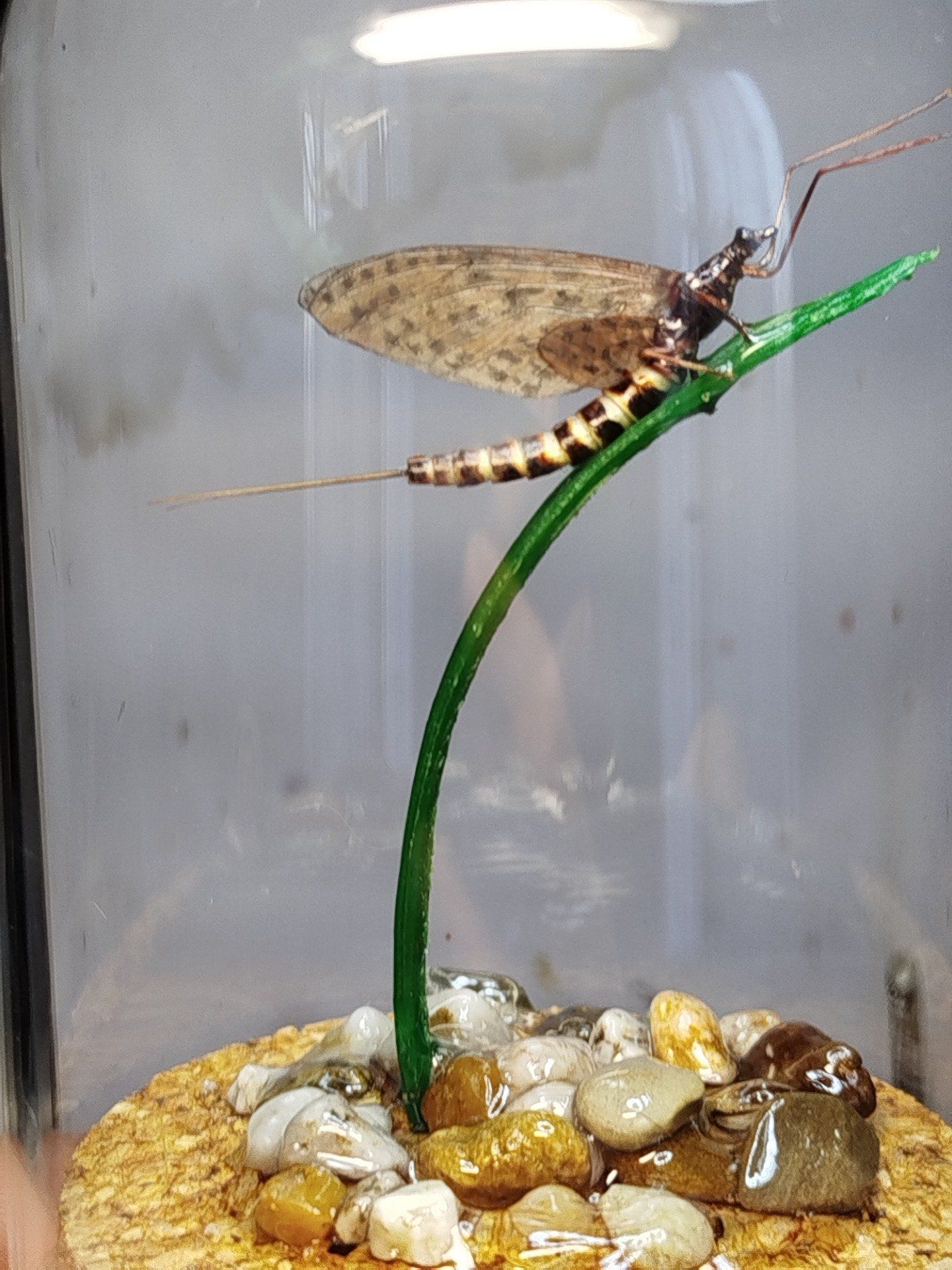 Heptageniidae, cloche en verre 6cm de diametre, hauteur 10cm , socle liege
