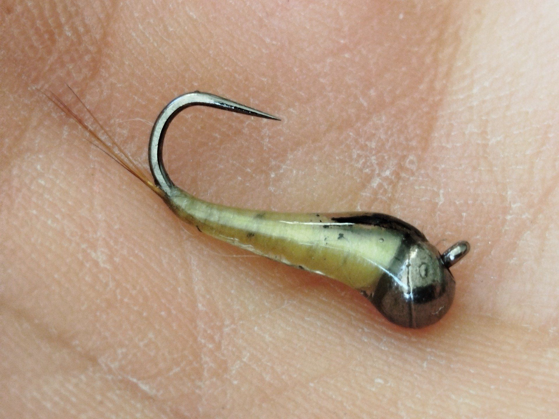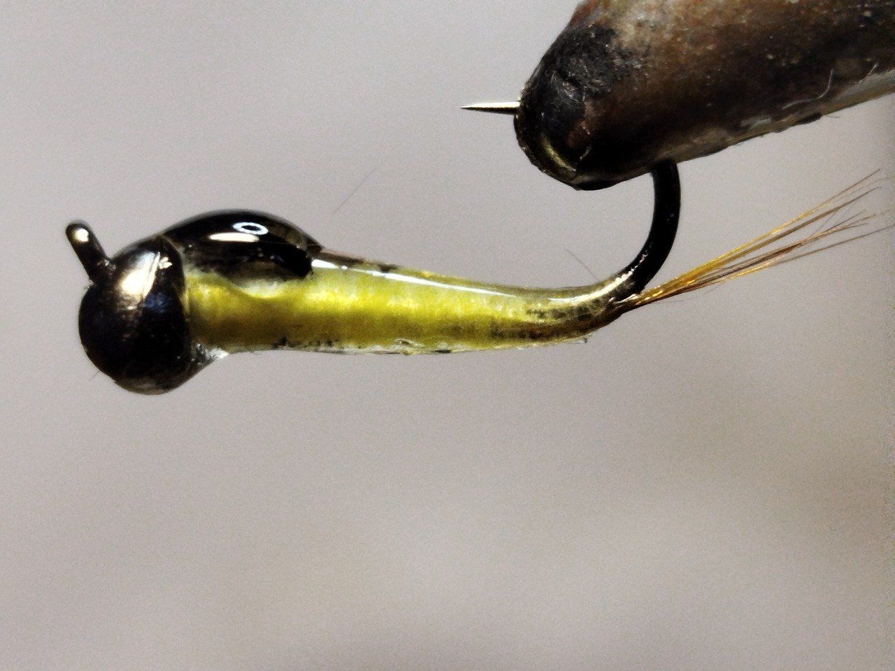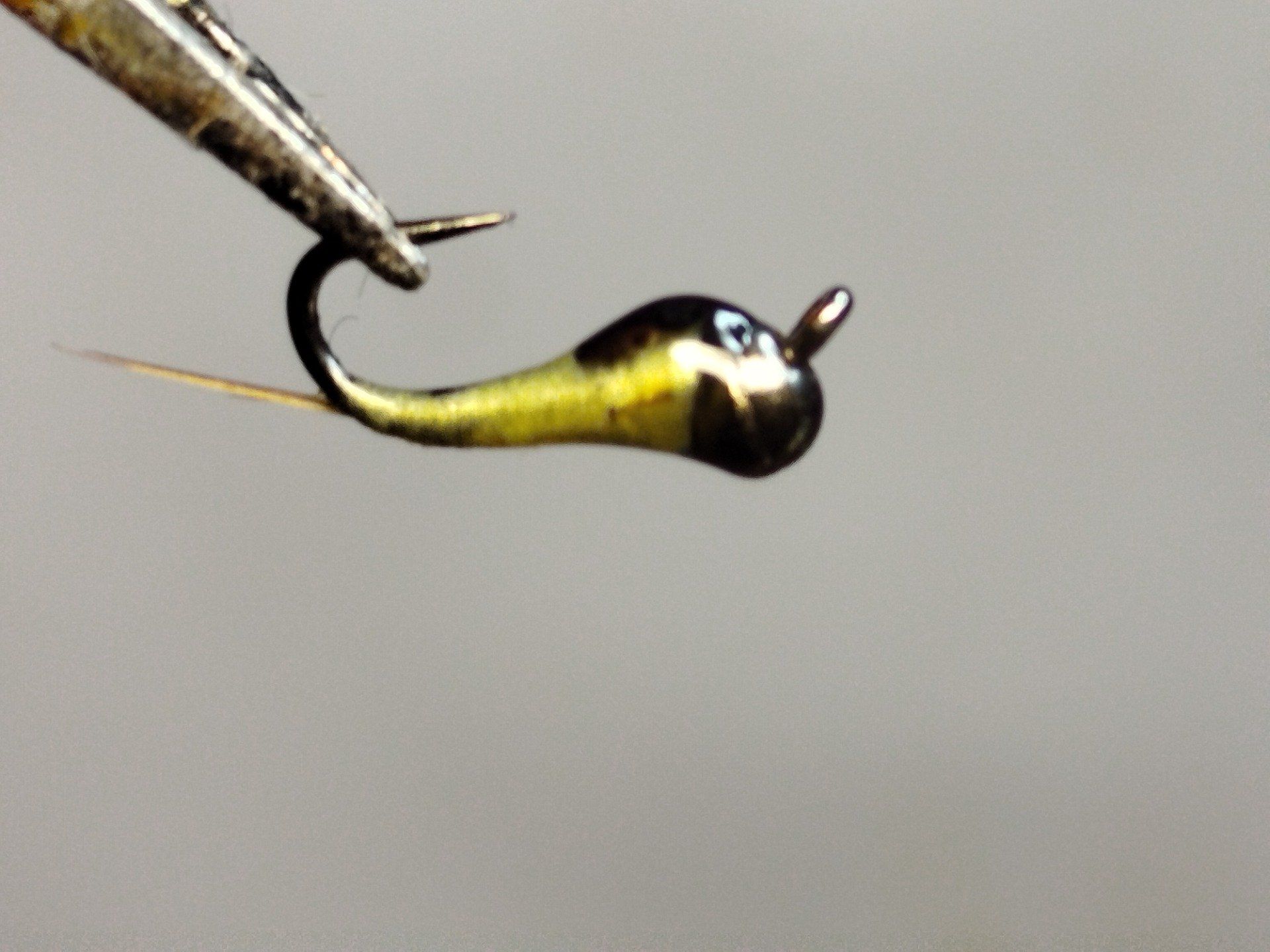 Cerques fin poils de pinceau, corps soie de montage light Cahill, tag noir dessus, tungstène jig off, résine uv